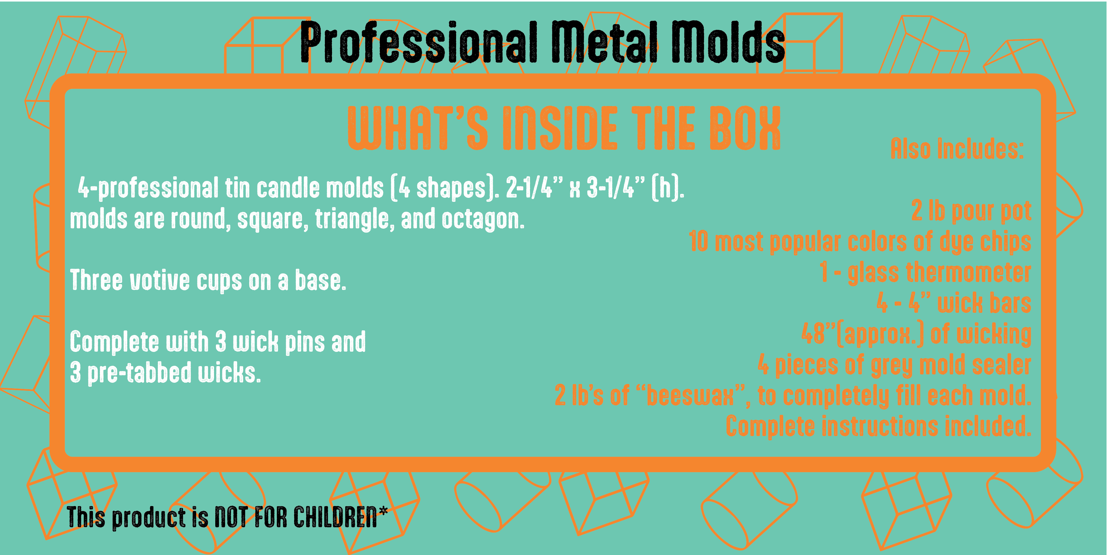 For container candle makers that are interested in giving pillar candle molds a try we have a complete kit for you ! Included is everything you need to fill all the molds and begin your exploration. Kits come with White beeswax or yellow wax upon request.